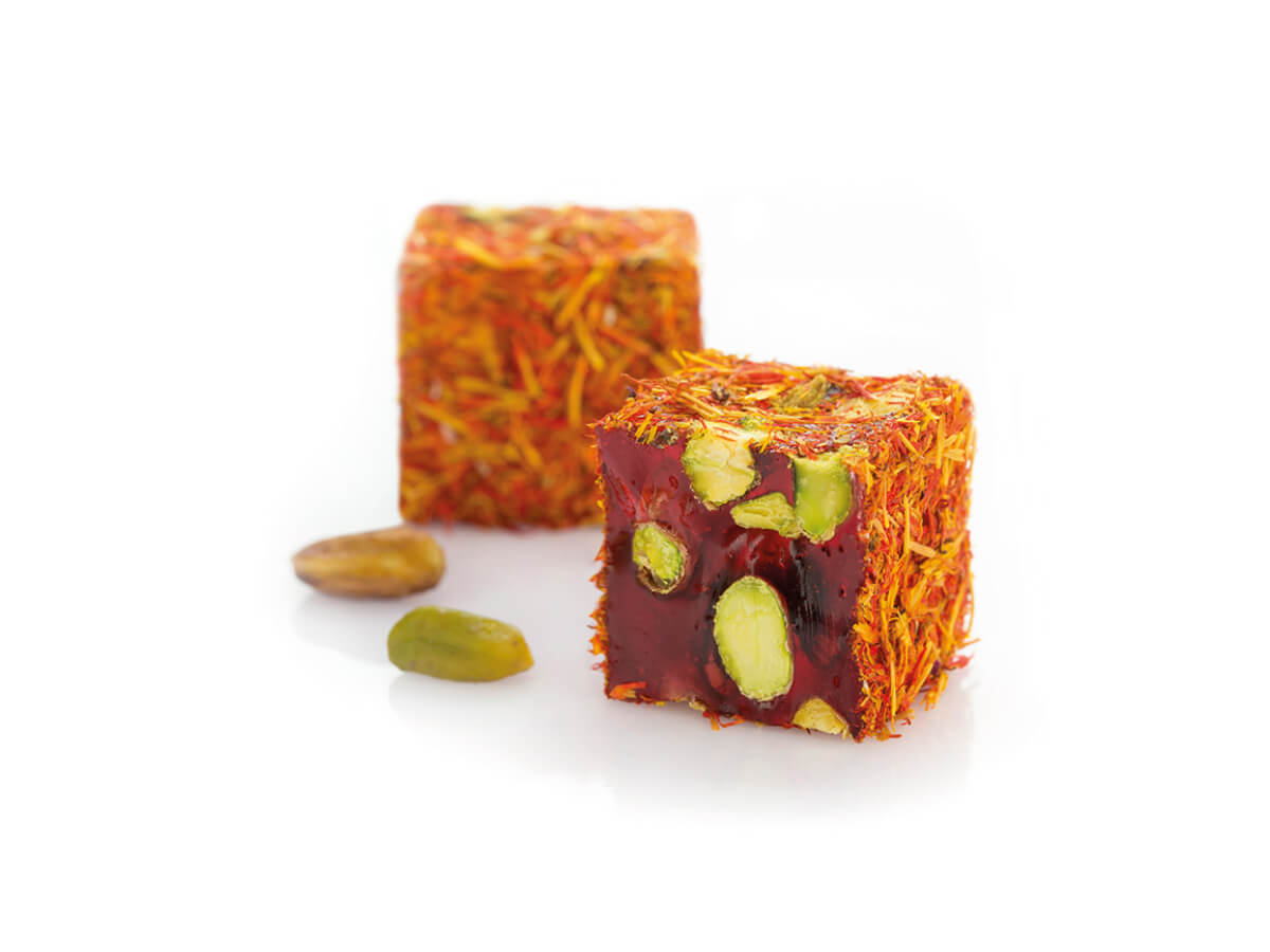 Aspir Çiçeği Kaplı Nar Aromalı Fıstıklı Lokum, narın ekşi-tatlı ferah aromasıyla fıstığın yoğun lezzetini buluşturur. Üzerini kaplayan aspir çiçeği yaprakları lokuma hem zarif bir görünüm hem de farklı bir aroma kazandırır. Misafir ikramlarından özel günlere, günlük keyiflerden hediyelik sunumlara kadar her an için seçkin bir tatlı alternatifi sunar.