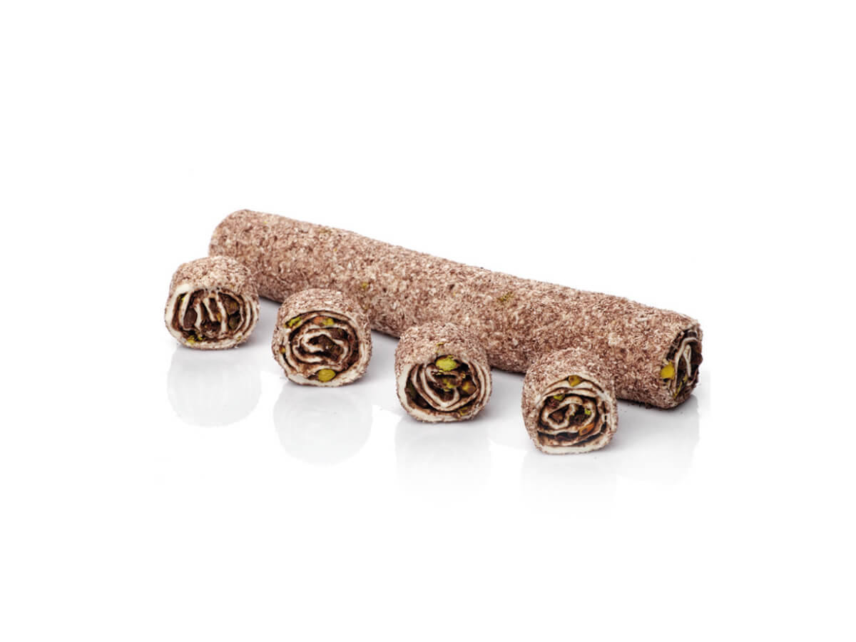 Antep Fıstıklı Kakao Kaplı Çikolatalı Lüks Sarma, kakaonun yoğun aromasıyla çikolata kremasının yumuşak dokusunu buluşturur. İçindeki bol Antep fıstığı her lokmada taze ve doyurucu bir lezzet sunar. Zarif görünümü ve zengin tadıyla özel günler ve misafir ikramları için mükemmel bir tercihtir.