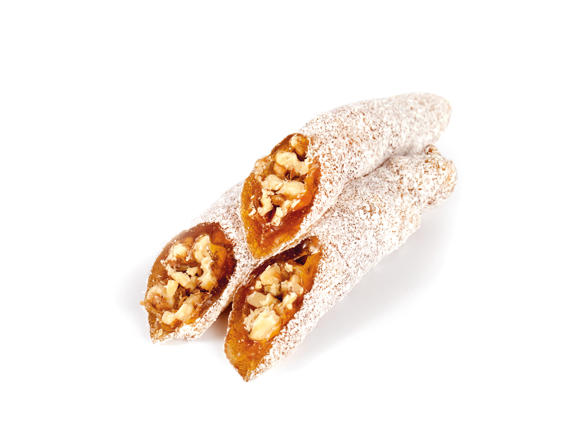 Hindistan Cevizi Kaplı Cevizli Sucuk Lokum, ceviz tanelerinin doyurucu lezzetini Hindistan cevizinin hafif tatlı aromasıyla buluşturur. Her lokmada cevizin doğal tadı ve Hindistan cevizinin yumuşak dokusu hissedilir. Geleneksel Türk lezzetini modern bir dokunuşla sunan bu lokum, özel günler ve misafir ikramları için ideal bir tercihtir.