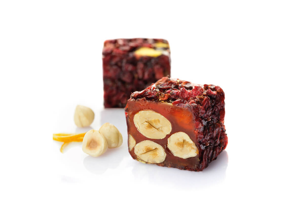 Zereş Üzümü Kaplı Portakal Aromalı Fındıklı Lokum, portakalın taze ve ferah aromasıyla fındığın doğal lezzetini buluşturur. Üzerini kaplayan zereş üzümleri lokuma hafif mayhoş bir tat ve göz alıcı bir görünüm kazandırır. Günlük keyiflerden özel günlere, misafir ikramlarından hediyelik sunumlara kadar her an için farklı ve şık bir tatlı alternatifidir.