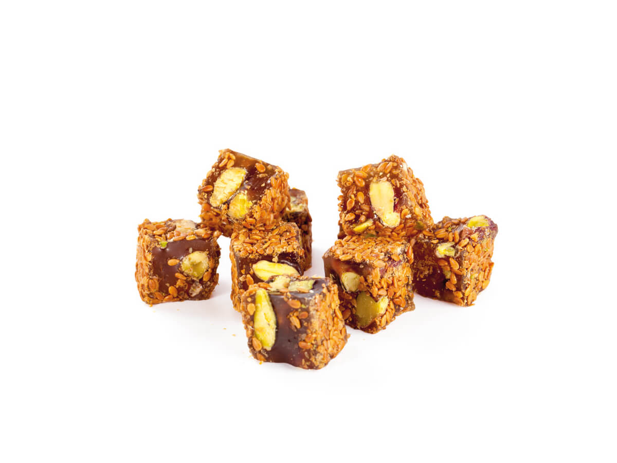 Antep Fıstıklı Susam Kaplı Çifte Kavrulmuş Lokum, çifte kavrulmuş fıstığın yoğun aromasıyla susamın kendine özgü kavruk tadını bir araya getirir. Üzerini kaplayan susam taneleri lokuma hem çıtır bir doku hem de benzersiz bir aroma kazandırır. Özel günler, misafir ikramları ve hediyelik sunumlar için klasik ve farklı bir tatlı alternatifidir.