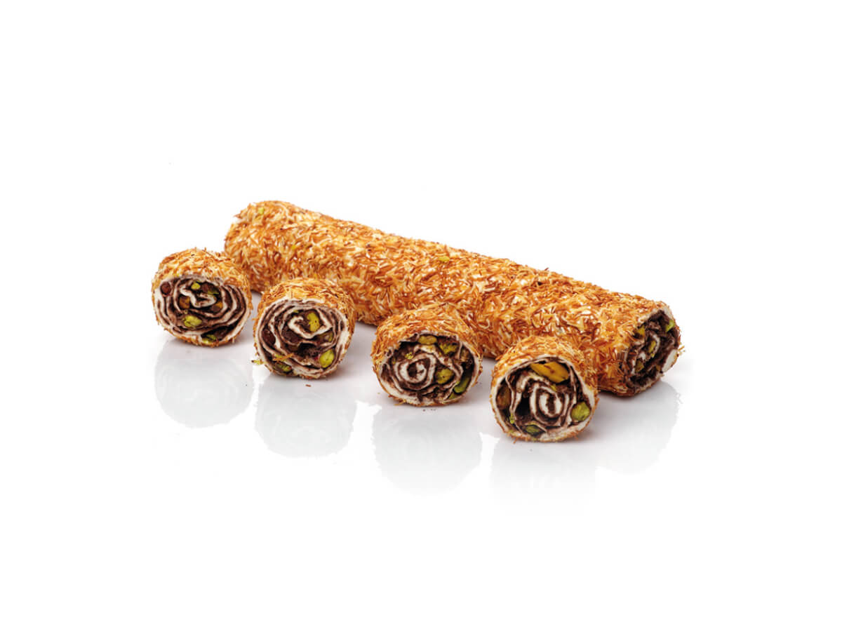 Antep Fıstıklı Kadayıf Kaplı Çikolatalı Lüks Sarma, çıtır kadayıf kaplamasıyla çikolata kremasının yoğun lezzetini bir araya getirir. İçindeki bol Antep fıstığıyla her lokmada zengin ve dengeli bir tat sunar. Hem görünümü hem de lezzetiyle özel günler ve misafir ikramları için seçkin bir tercihtir.