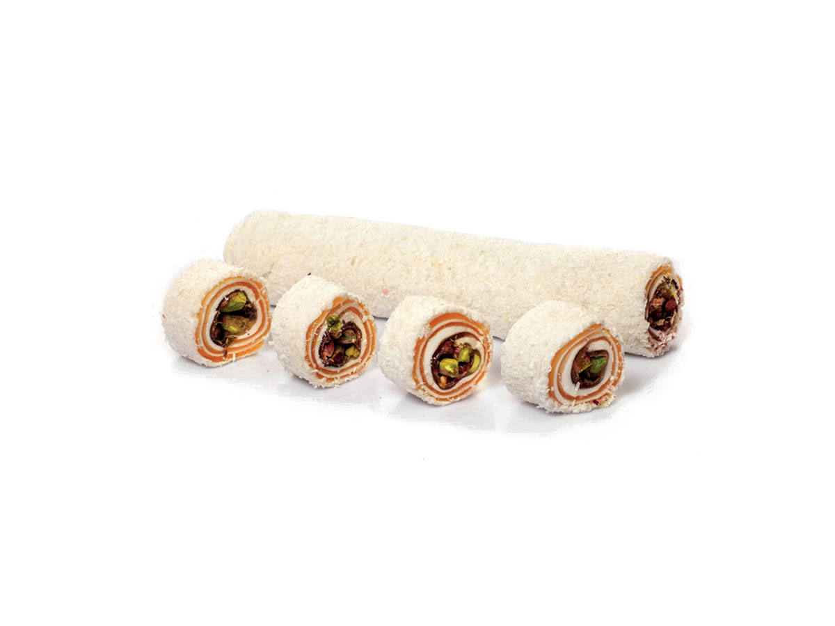 Antep Fıstıklı Narlı Hindistan Cevizi Kaplı Sultan Lüks Sarma, narın ferah aromasıyla Antep fıstığının yoğun lezzetini buluşturur. Hindistan cevizi kaplaması sayesinde yumuşacık bir doku ve hafif tatlı bir denge sunar. Her lokmada narın tazeliği ve fıstığın aroması hissedilen bu özel sarma, şık ikramlar ve özel günler için mükemmel bir tercihtir.